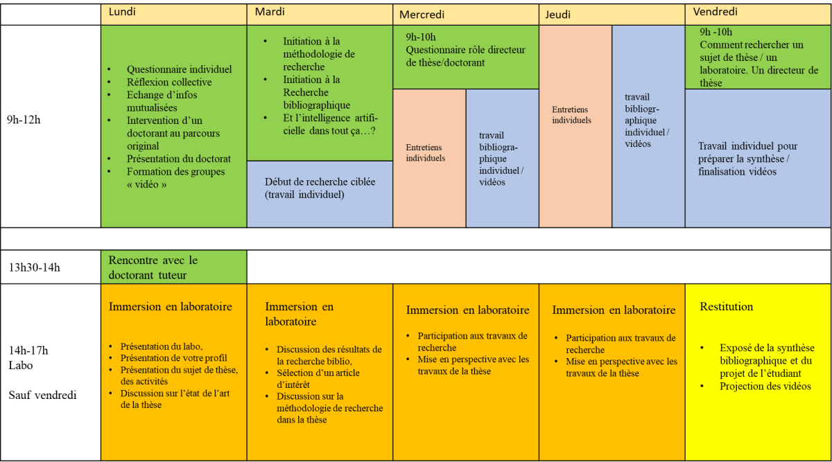 La formation a pour but de sensibiliser les étudiants aux métiers de la recherche et notamment à la possibilité de réaliser une thèse de doctorat pour préparer une carrière en recherche dans le milieu académique ou dans le monde socio-économique. Cette formation intègre un volet réflexif sur les aptitudes nécessaires aux métiers de la recherche et également un volet d’initiation à la recherche en apportant quelques outils méthodologiques utilisés en recherche.
